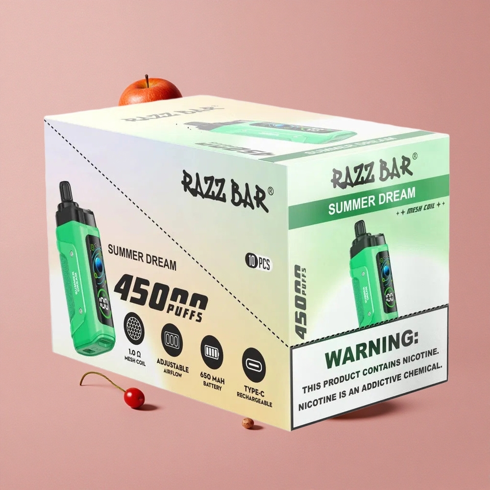 Razz Bar 45000 Puffs Vape Jetable Rêve d’Été avec Bobine Mesh 1.0 Ohm et Batterie 650 Mah Rechargeable Type-C